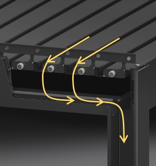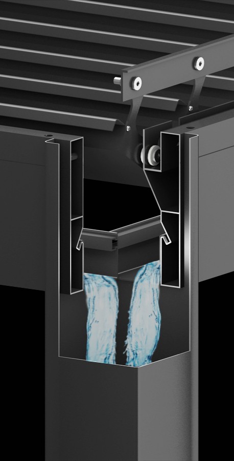 In the roof of the pergola there are built-in gutters that lead away the water in case of rain. When it rains, the gutters lead the water to the four outer pillars where it is then led down directly to the ground. This means that no water accumulations form on the roof, which risks damaging or arching the roof.